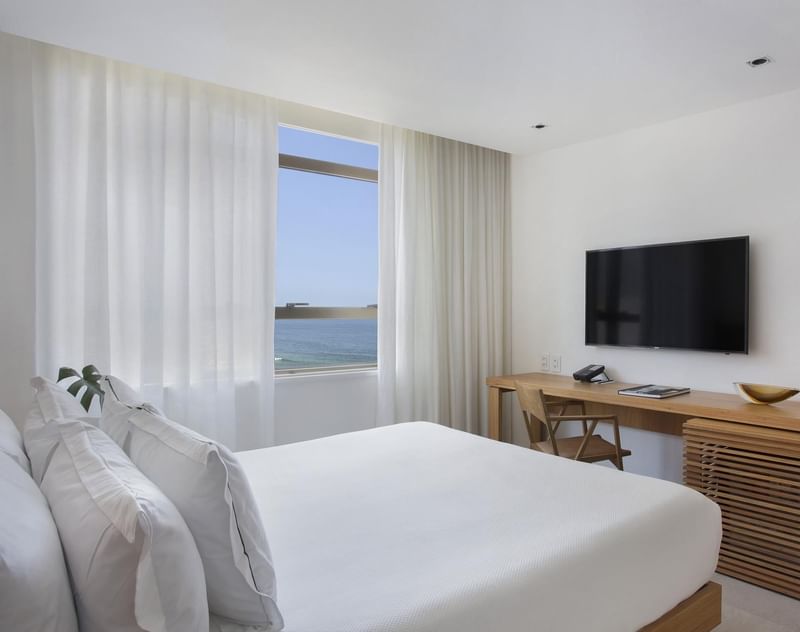 Quarto com vista lateral para o mar e bairro do Leblon. Banhado por luz natural, tem design minimalista. Disponível para combinação com o quarto Deluxe.